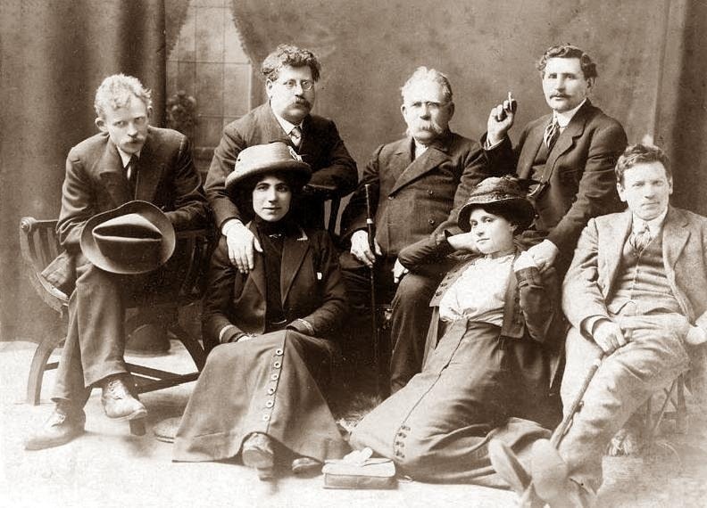 De gauche à droite : Ernst Simmerling, Rudolf Rocker, Wuppler, Lazar Sabelinsky, Loefler ; assises : Milly Witkop-Rocker et Milly Sabel.