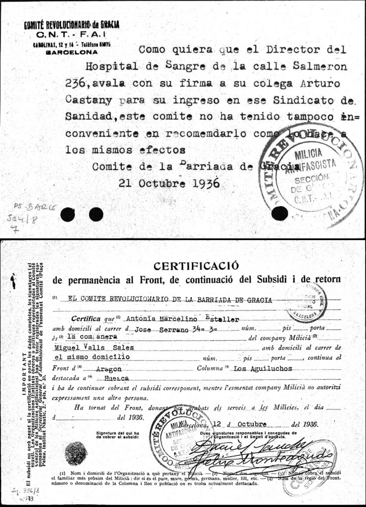 « Dès le premier jour du combat, nous, médecins de la CNT-AIT, avons constitué, grâce à l’organisation sanitaire ouvrière, le premier contrôle sanitaire qui fut également le premier effort de cohésion organique des services sanitaires de la Catalogne. Quand le moment sera venu, nous décrirons ces journées frénétiques au cours desquelles le contrôle sanitaire de la CNT-AIT improvisait, à une vitesse vertigineuse, les solutions que réclamaient les innombrables problèmes qui surgissaient sans arrêt. »