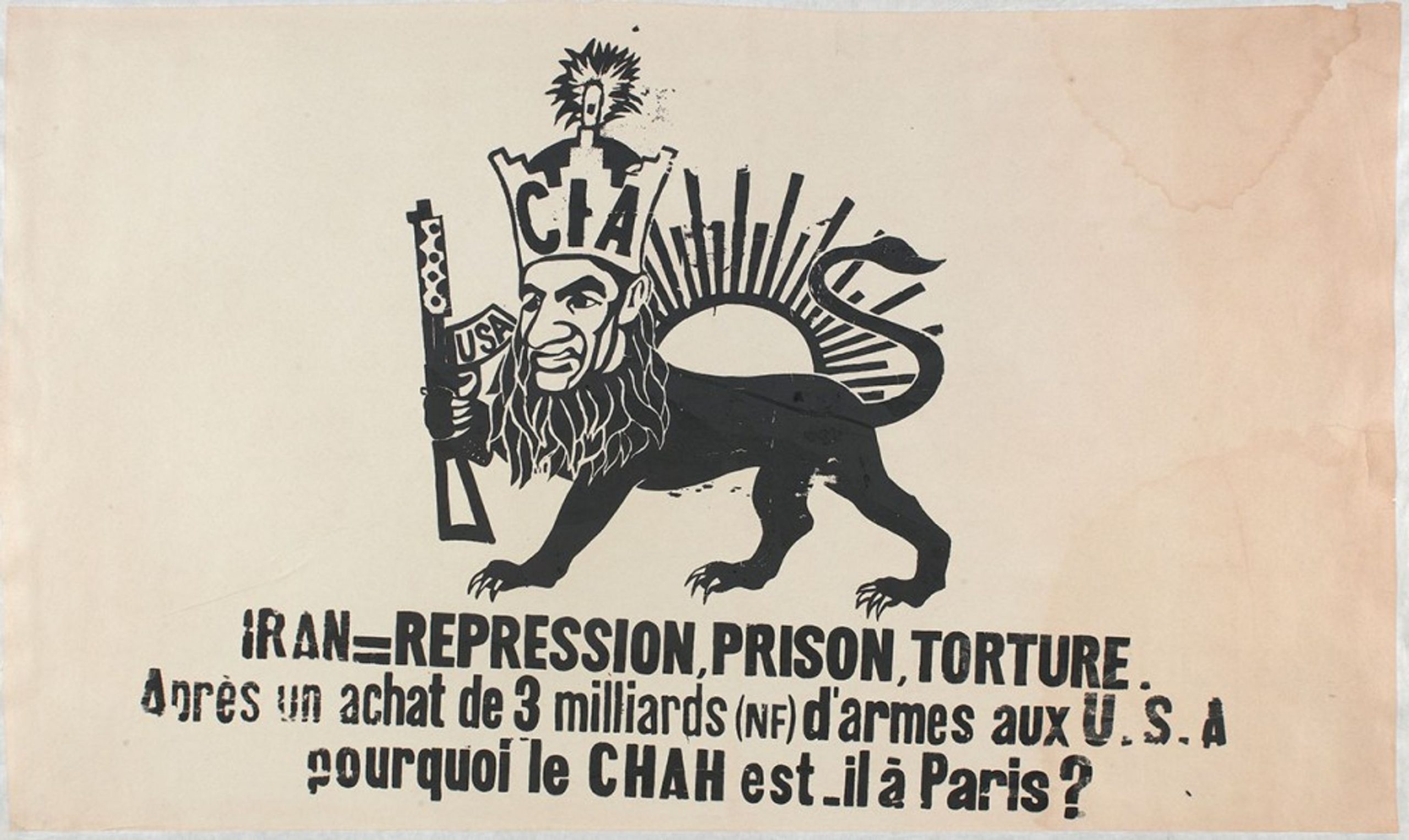 Les dictateurs sont allergiques à l’art libre. Tout comme la caricature de Pahlavi a été interdite, aujourd’hui la caricature de Khamenei est également interdite. En mai 1968, l’Atelier du Peuple des Beaux-Arts de France publie le dessin suivant et écrit : « Iran = répression, prison, torture/Après avoir acheté trois milliards de francs d’armes à l’Amérique, pourquoi le Shah est-il à Paris ? »