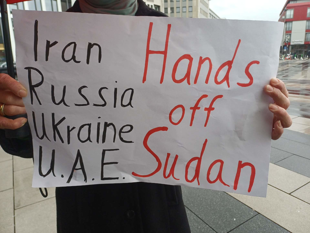 Les manifestants, issus de la communauté soudanaise en exil et brandissant de nombreux drapeaux nationaux, étaient accompagnés de sympathisants internationalistes. Ensemble, ils ont exigé la fin des attaques brutales contre la population civile et l’arrêt de toute ingérence étrangère dans les milices tant de l’armée (SAF) que des milices Janjawid (RSF), qui se disputent le contrôle des mines d’or.
