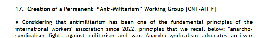 • Considérant que l’antimilitarisme est l’un des principes fondamentaux de l’association internationale des travailleurs depuis 1922, principes que nous rappelons ci-dessous : « L’anarchosyndicalisme lutte contre le militarisme et la guerre. L’anarchosyndicalisme prône la propagande anti-guerre et le remplacement des armées permanentes, simples instruments de contre-révolution au service du capitalisme, par des milices ouvrières qui, pendant la révolution, seront contrôlées par les syndicats ; il exige également le boycott et l’embargo de toutes les matières premières et de tous les produits nécessaires à la guerre, à l’exception des pays où les travailleurs sont en pleine révolution sociale, auquel cas nous devons les aider à la défendre. Enfin, l’anarcho-syndicalisme prône la grève générale préventive et révolutionnaire comme moyen de s’opposer à la guerre et au militarisme. »