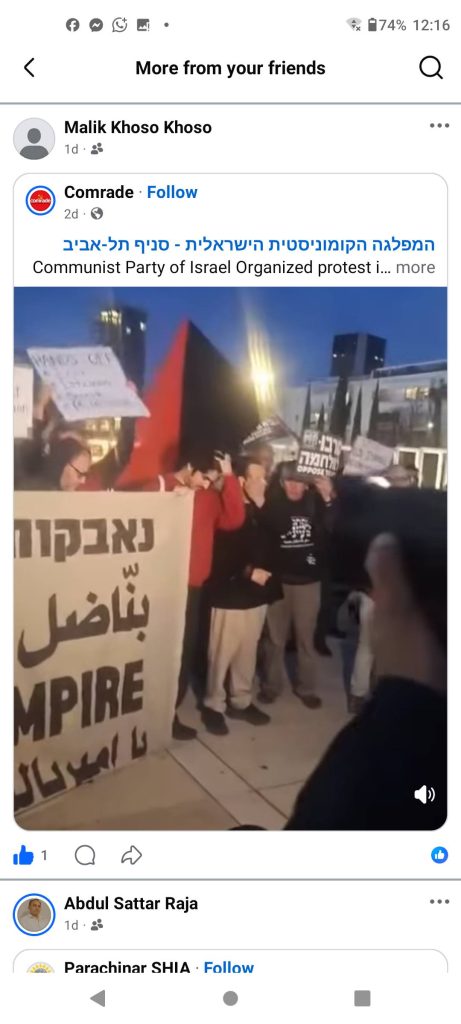 Hier encore, à la mort du compagnon Zubair Rehman, il prétendait qu’il était un « simple communiste ». Mes amis, indignés, me disent : « Frère, ne publie pas de tels propos. » Ci-dessous, je partage également des photos du « drapeau anarchiste » brandi par les participants à cette manifestation. Il est important de noter que la plupart des victimes de l’attaque du Hamas étaient des « anarchistes kibbutzim » qui ont même pardonné aux Palestiniens [les morts].