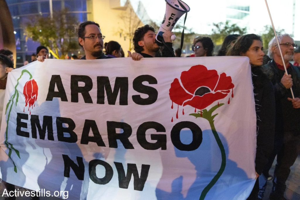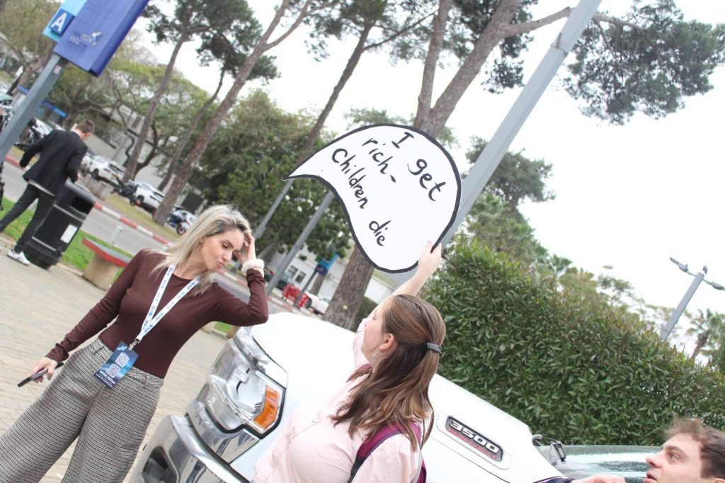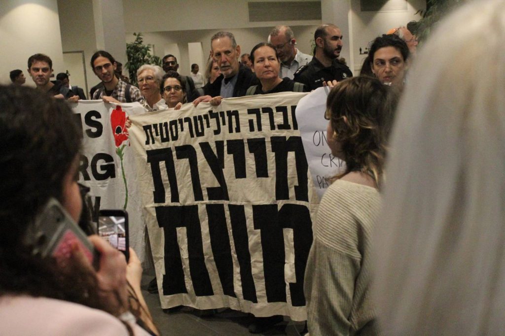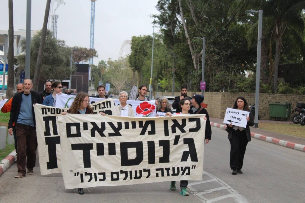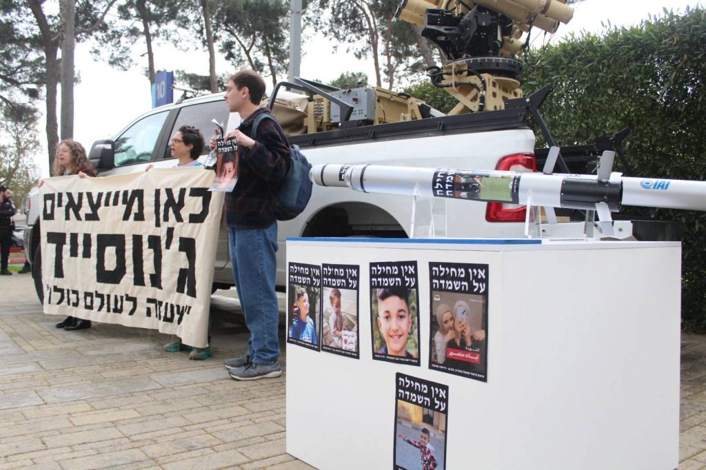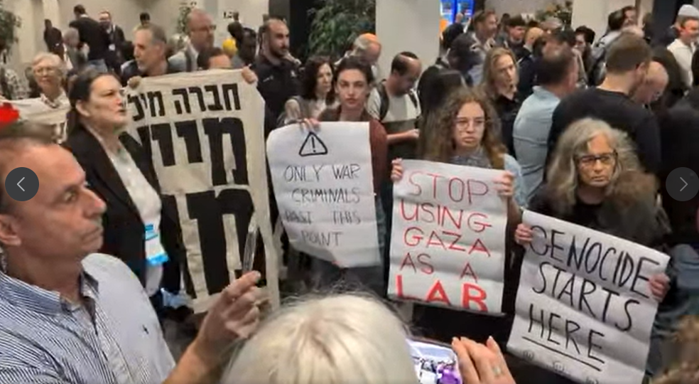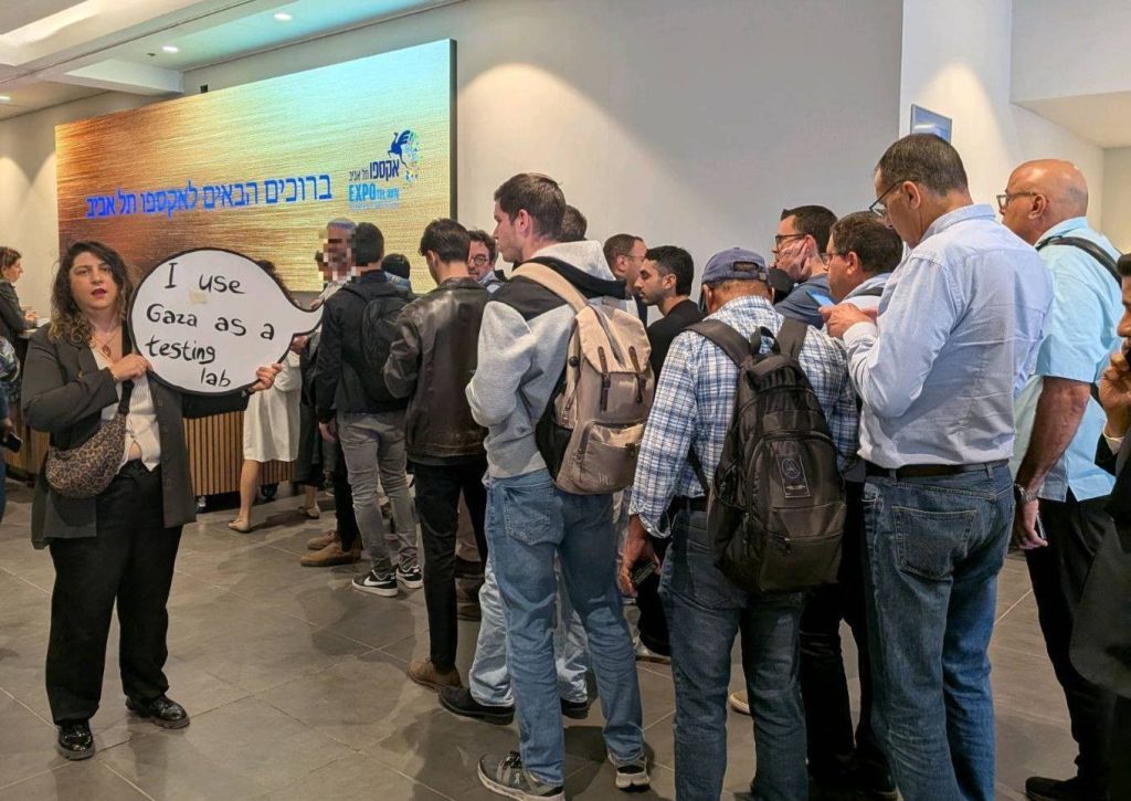 היום לפני הצהריים פעולה בתערוכת הנשק הגדולה בתל אביב שאליה הגיעו סוחרי נשק מכל העולם. והשתתפו בה חברות ישראליות שהשתמשו במערכות שלהם בג’נוסייד בעזה כדי אחר כך לשווק אותם כ »נוסו מבצעית » –