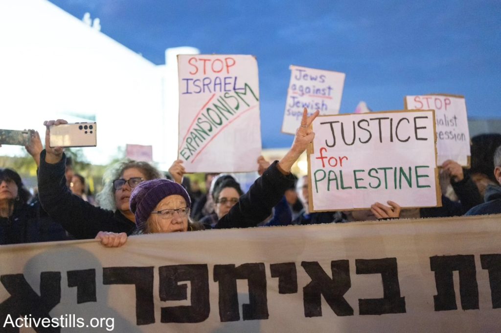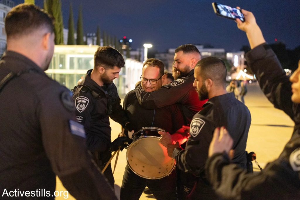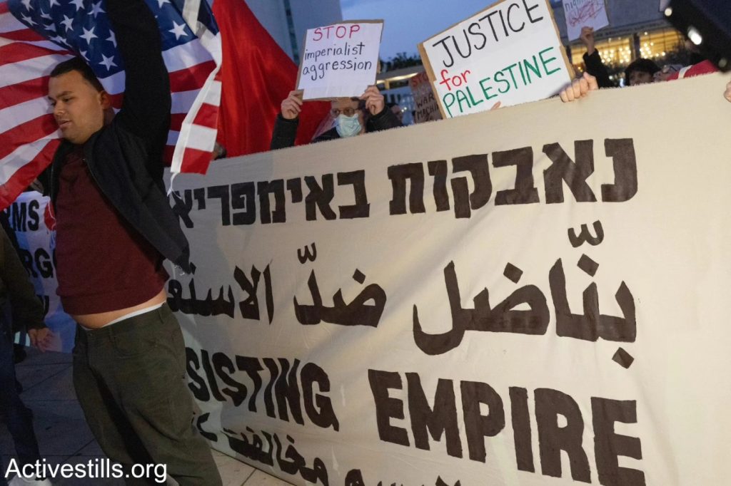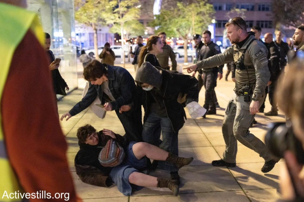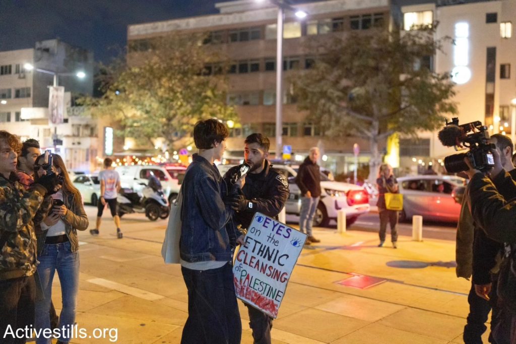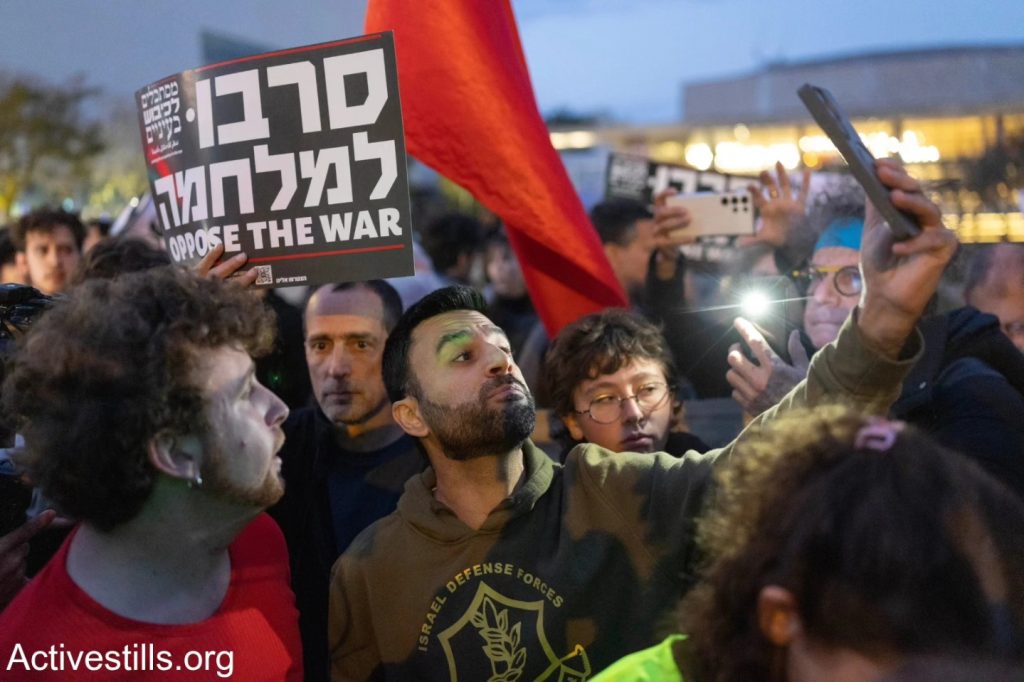 Le 7 mars, à Tel-Aviv des activistes antisionistes de Palestinien 48, ainsi que des anarchistes, ont manifesté contre la guerre menée par les États-Unis et Israël contre l’Iran, ainsi que contre les attaques contre le Liban et la Cisjordanie. Des agitateurs d’extrême droite ont perturbé la manifestation en brandissant un drapeau américain. Après quelques minutes, la police a dispersé la manifestation et arrêté un militant. Photos : @oren_ziv / Activestills